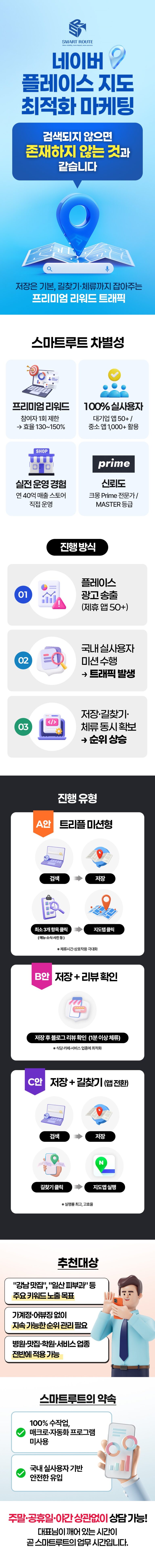 스마트루트는 매크로나 자동화 프로그램이 아닌, 국내 실사용자가 직접 수행하는 고품질 트래픽만을 제공합니다.